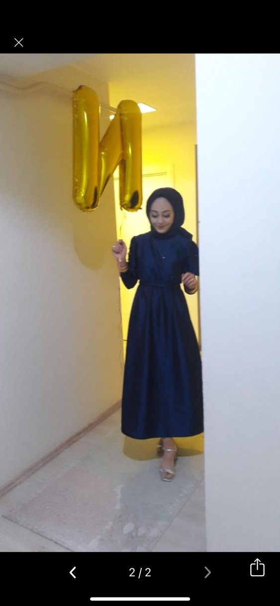 Lacivert, uzun kollu, yüksek yakalı ve drapeli tasarıma sahip, ipeksi dokulu, düzenli kesim kadın elbisesi. Minimalist ve sade tarz için uygundur.