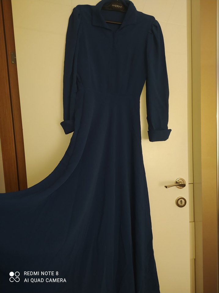 Lacivert renkte, uzun kollu ve drapeli detaylara sahip bu uzun elbise, notched lapel yakası ve regular fit kesimiyle klasik ve şık bir görünüm sunar.