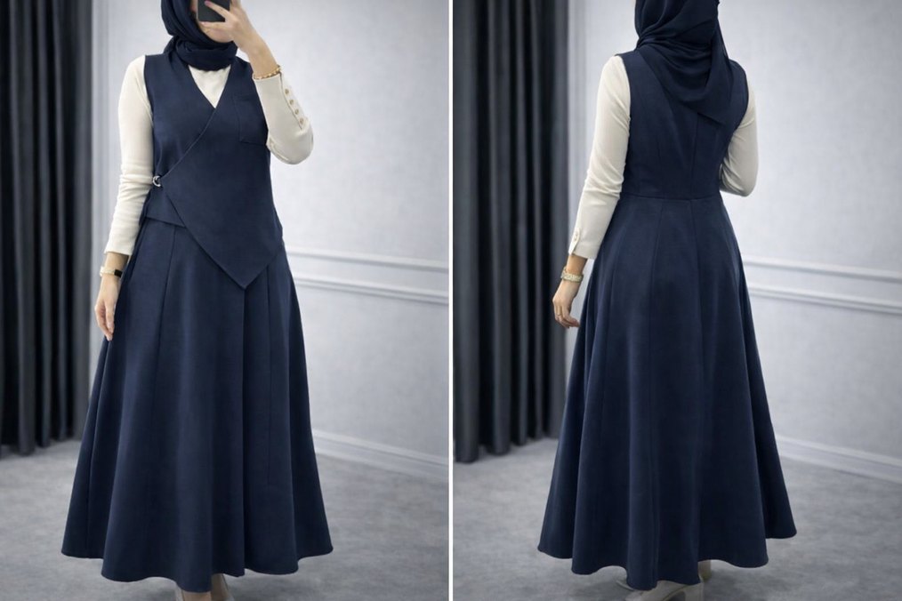 Lacivert Uzun Kollu Drapeli Ofis Elbisesi
