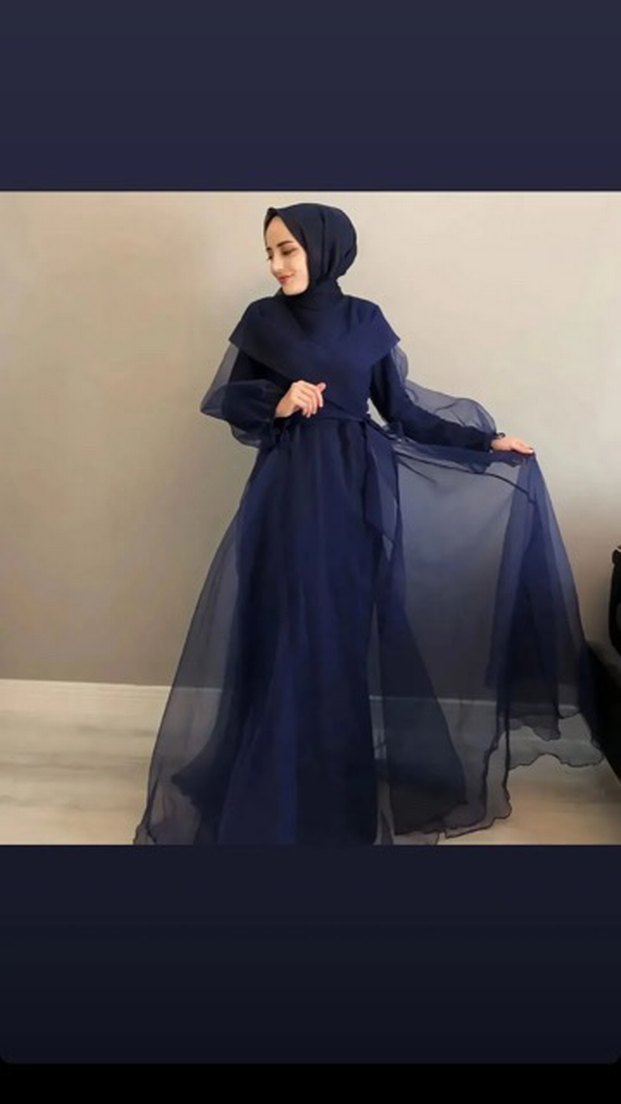 Lacivert renkli, uzun kollu, yüksek yakalı ve bol kesim drapeli kumaştan oluşan tesettür abiye, gotik ve mütevazı tarzlar için uygundur.