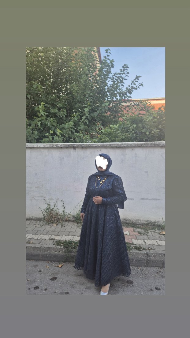 Lacivert renkli, uzun kollu, yüksek yakalı ve drapeli detaylara sahip bol kesim uzun abiye elbisedir. Desensiz ve koyu tonuyla mütevazı ve gotik tarzlara uygundur.