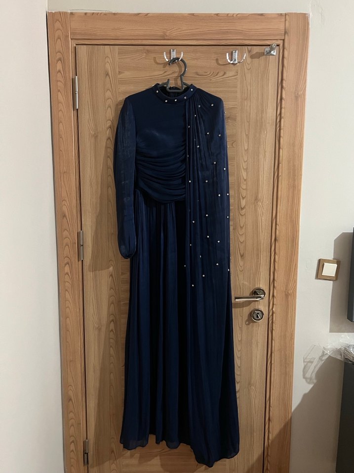 Lacivert renkte, yüksek yakalı ve uzun kollu drapeli uzun abiye elbise. Düzenli kesimle klasik ve gotik bir şıklık sunar, düğünler için uygundur. Desensiz ve koyu tonlardadır. Sadece 1 kez giyildi. Kolunda küçük bir dikiş atlaması vardı işim acil olduğu için değişim yerine elimde diktim resimlerde mevcut