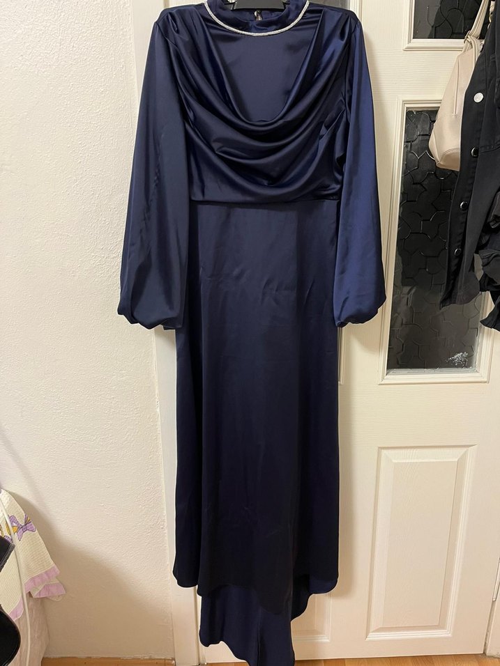 Lacivert renkte, drapeli yaka ve uzun kollu, bol kesim uzun gece elbisesi. Sade ve gotik tarzda, ofis için uygun.