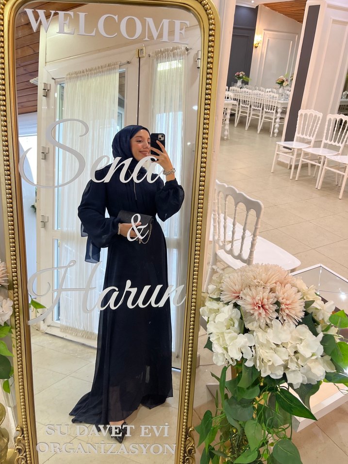 Lacivert renkte, yüksek yakalı ve uzun kollu, bol kesim uzun elbise. Kuyrukludur.Şifon kumaştır. 1 kere giyildi tertemiz şalıyla birlikte gönderilir.