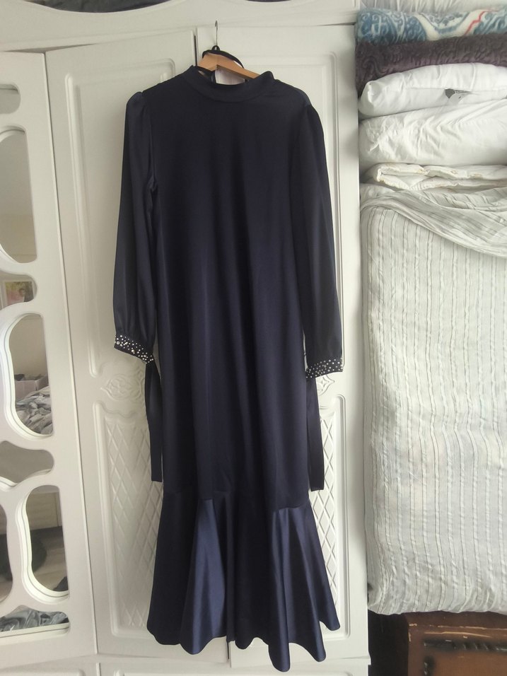Lacivert uzun kollu, yüksek yakalı ve dökümlü kesime sahip uzun elbise. İpeksi kumaştan, romantik akşamlar için uygundur. ✨