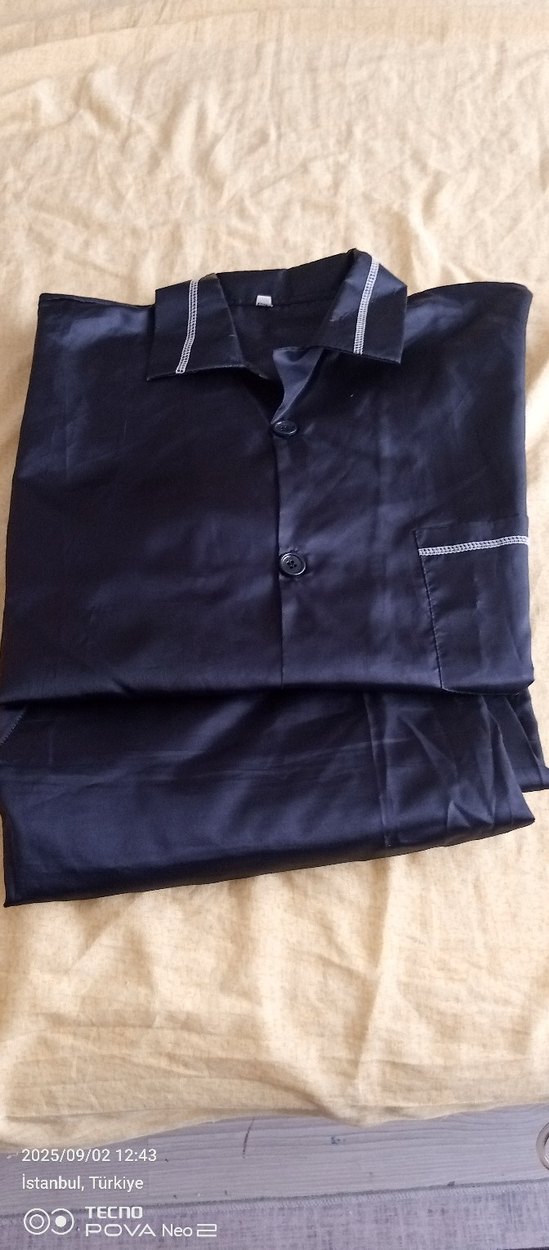 lacivert uzun kollu midi uzunlukta, düğmeli ve göğüs cepli erkek pijama takımı. Rahat kesimli ve minimalist tarzda, yumuşak kumaştan. 1 defa giyildi