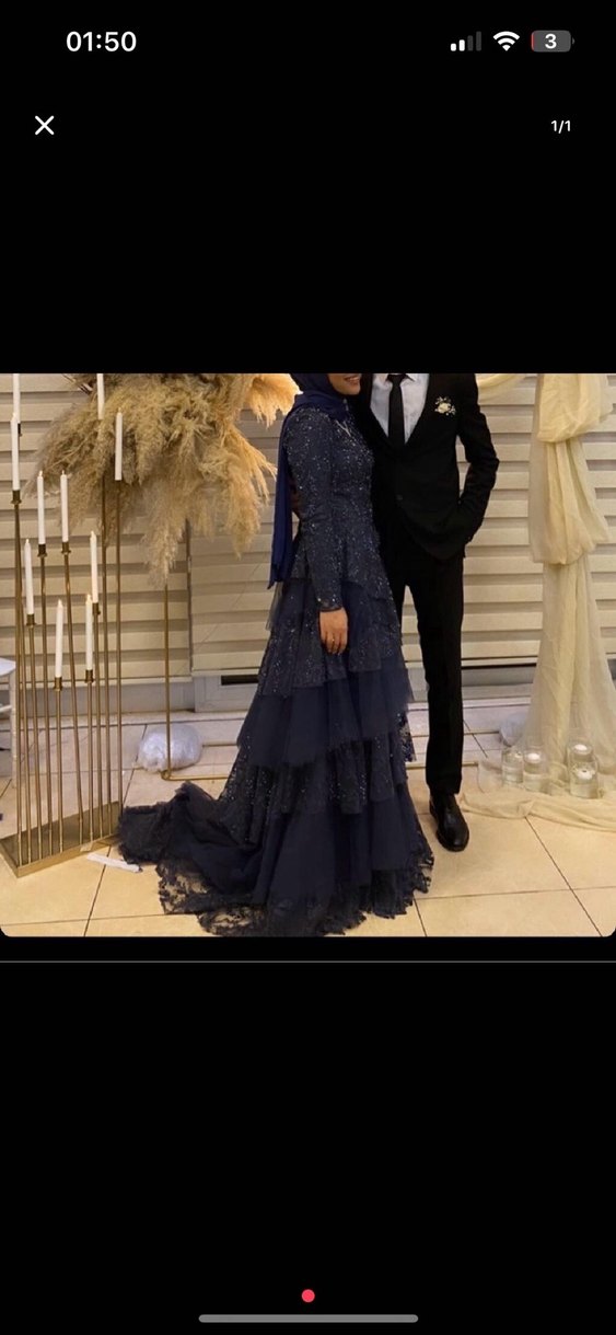 Lacivert uzun kollu, yakası kesimli, desenli ve fırfırlı detaylara sahip uzun abiye elbisedir. Düzenli kesim ve gotik tarzda, düğünler için uygundur. Kenzel markasına ait nişanımda 1 kez giydim