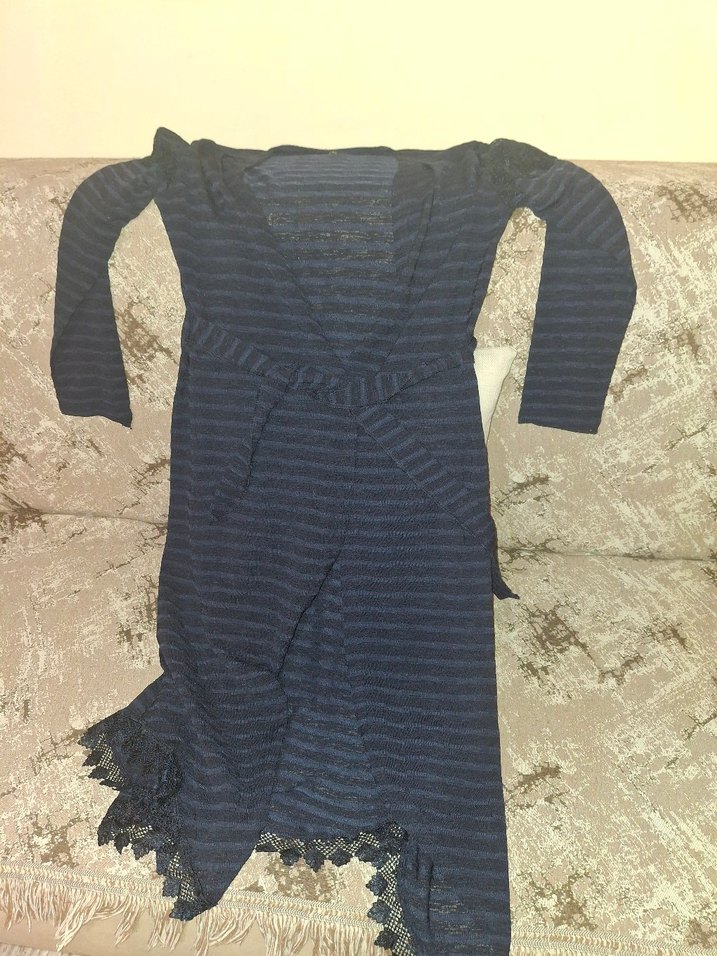 Lacivert uzun kollu triko elbise, fitted kesim ve drapeli tasarıma sahiptir. Kayık yaka ve dantel detaylı etek ucu ile gotik tarzı yansıtır.