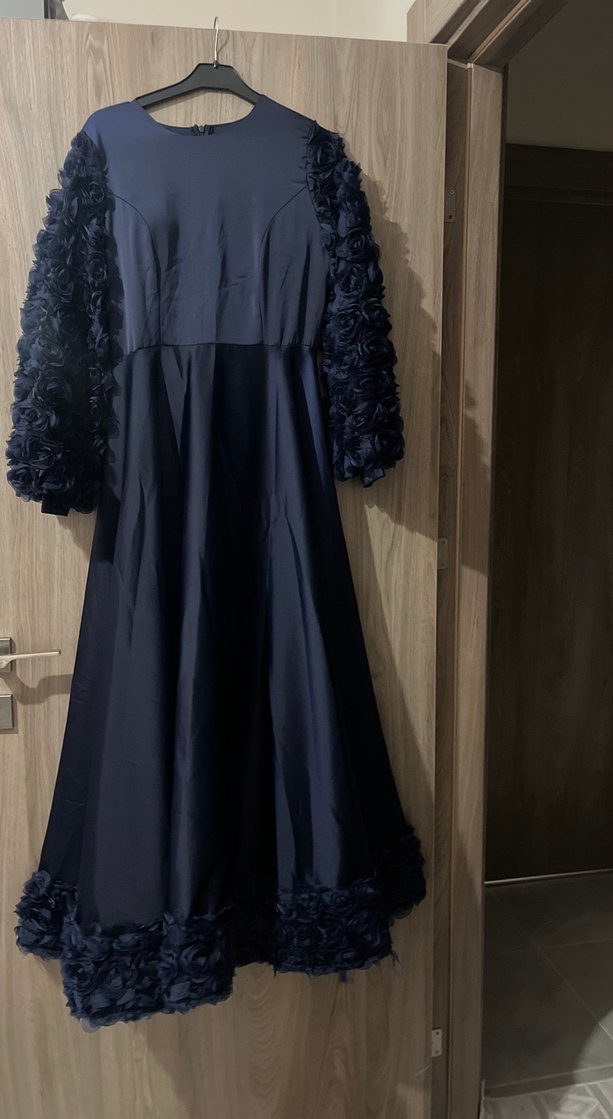 Lacivert uzun kollu, yüksek yakalı ve bol kesim gotik abiye elbise, kol ve etek ucu gül detaylıdır.