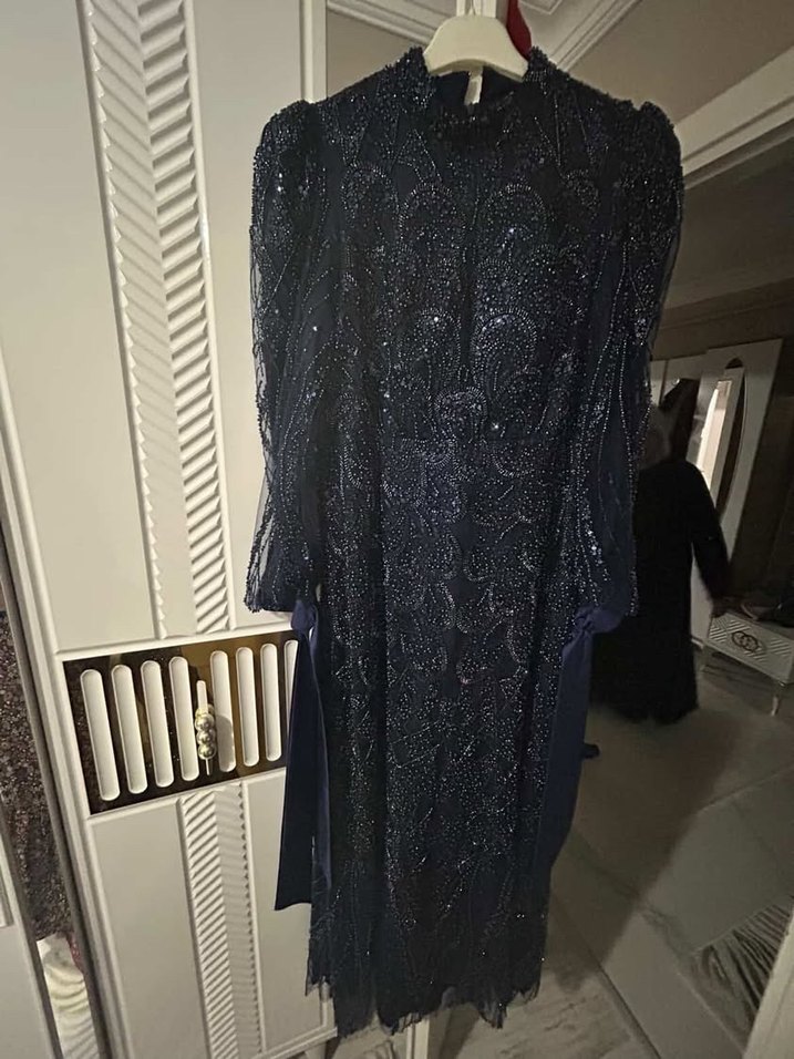 Bu dar kesim uzun gece elbisesi, yüksek yakalı ve uzun kolludur. Drapeli, desenli lacivert kumaştan yapılmıştır. Gotik tarzda klasik bir zarafet sunar, partiler için uygundur. 42 44 bedene uygundur 2 saat tek giyildi