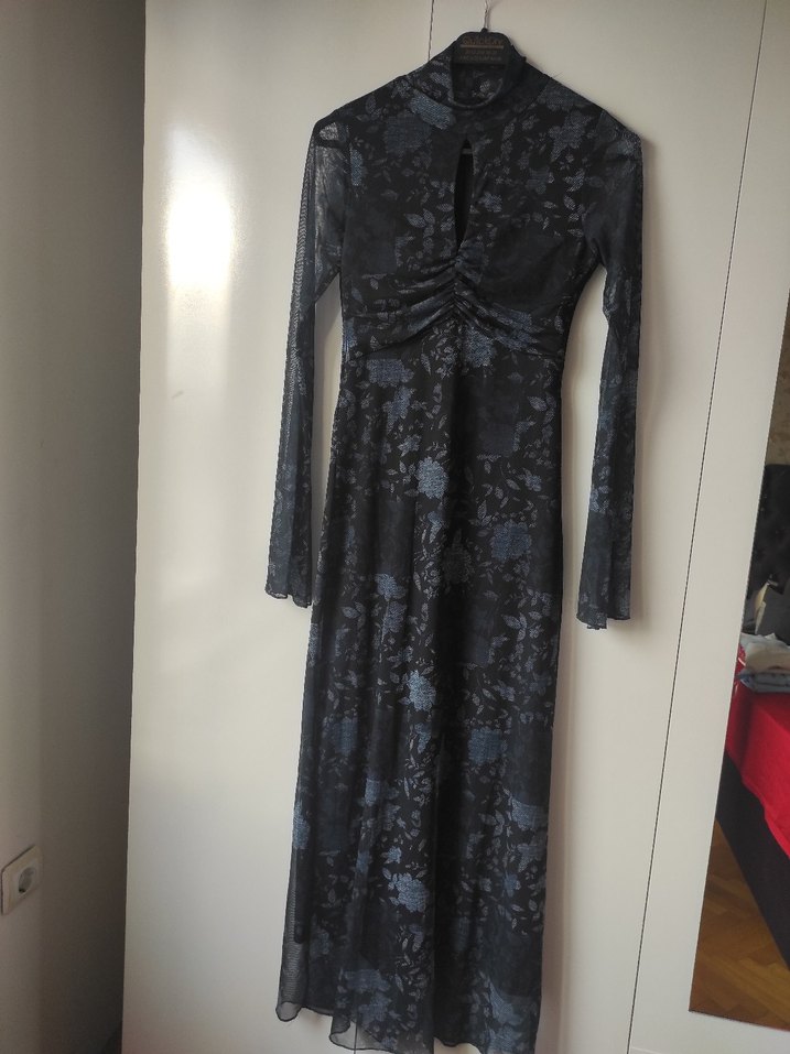 1 kere giyildi.Lacivert tie-dye desenli, uzun kollu ve yüksek yakalı, vücuda oturan uzun elbise. Yumuşak sentetik kumaştan, romantik akşamlar için uygun.