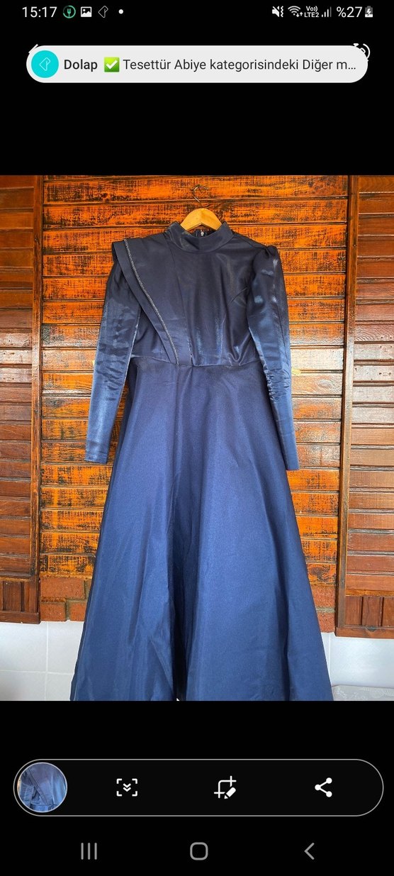 Lacivert uzun elbise, yüksek yakalı ve uzun kollu olup, gotik ve avant-garde tarzda drapeli detaylara sahiptir. Düğünler için uygundur.
