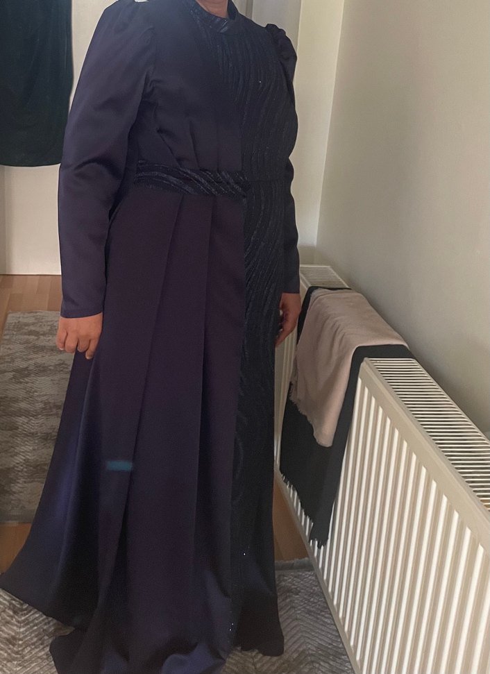 Lacivert renkte, uzun kollu ve drapeli bu uzun elbise,