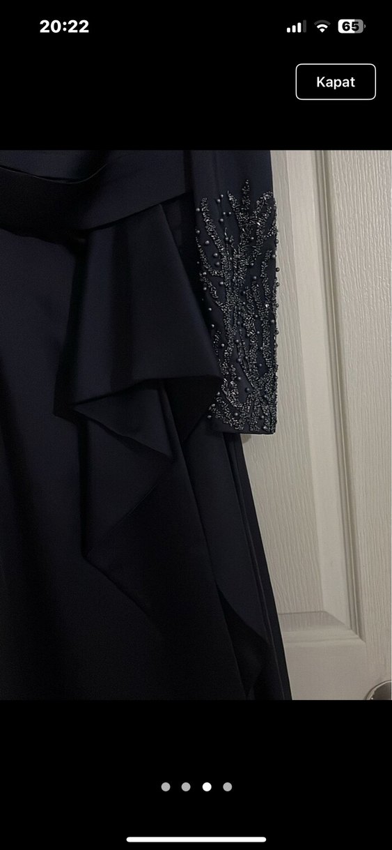 Lacivert uzun abiye elbise, fırfır ve işlemeli detaylara sahip, yakası kesimli ve askılı kolludur. Gotik ve klasik şıklık sunar.