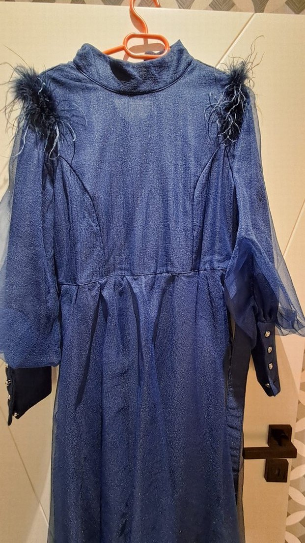 Lacivert renkli, yüksek yakalı ve uzun, şeffaf drapeli kollara sahip uzun abiye elbise. Düğme detayları ve bol kesimiyle düğün için uygun.Kemerü mevcuttur.Üzerinde 44 beden yazıyor 42 44 e uygundur.Yanında şalı bulunmaktadır.