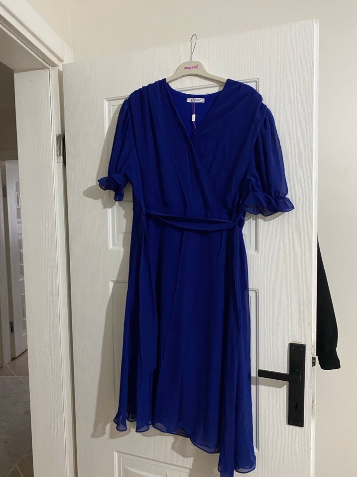 Lacivert renkli, kısa kollu, uzun ve bol kesim kadın elbisesi minimal ve sade normcore tarzını yansıtıyor. Desensiz tasarımıyla şık ve rahat.