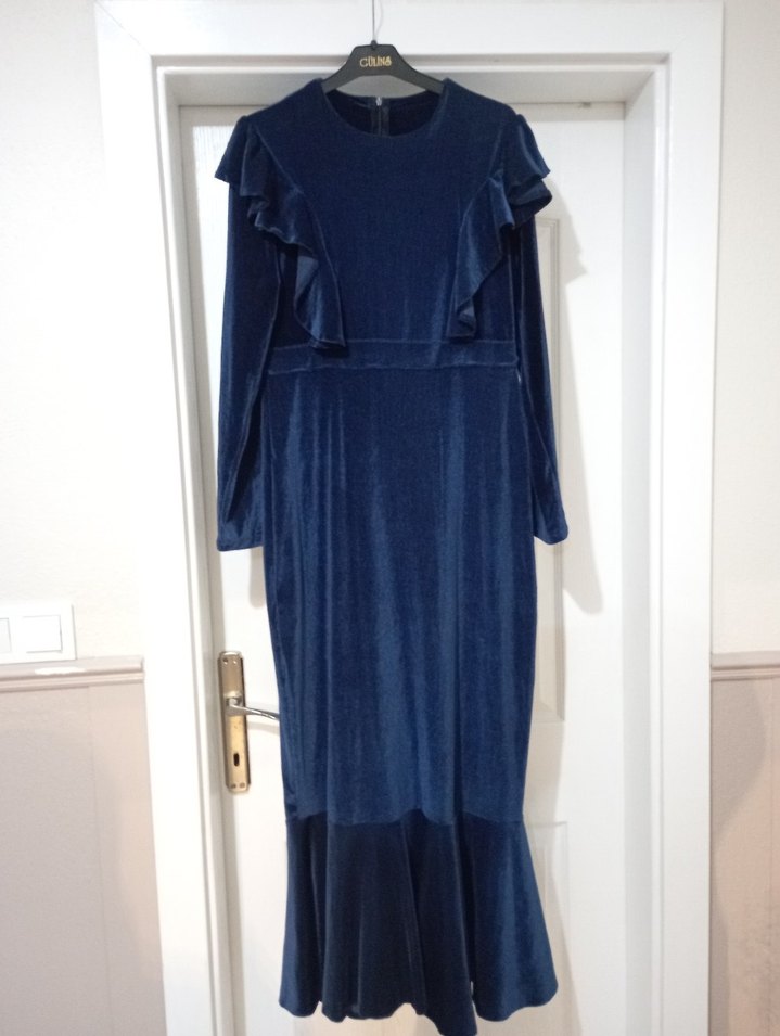 Lacivert uzun kollu, fırfırlı detaylı, yuvarlak yaka kadife elbise 38-40 beden uyumlu