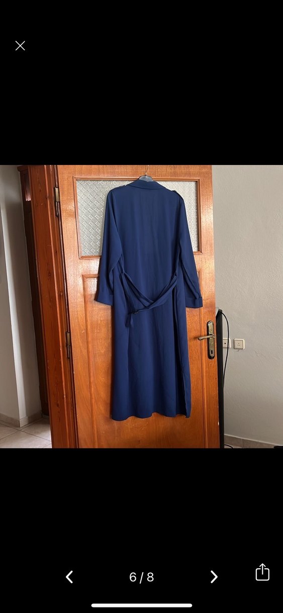 Lacivert renkli, uzun kollu kadın kap, düzenli kesim ve uzun boydadır. Belde kuşaklı, desensiz tasarıma sahip, Paris tarzı normcore şıklığında.