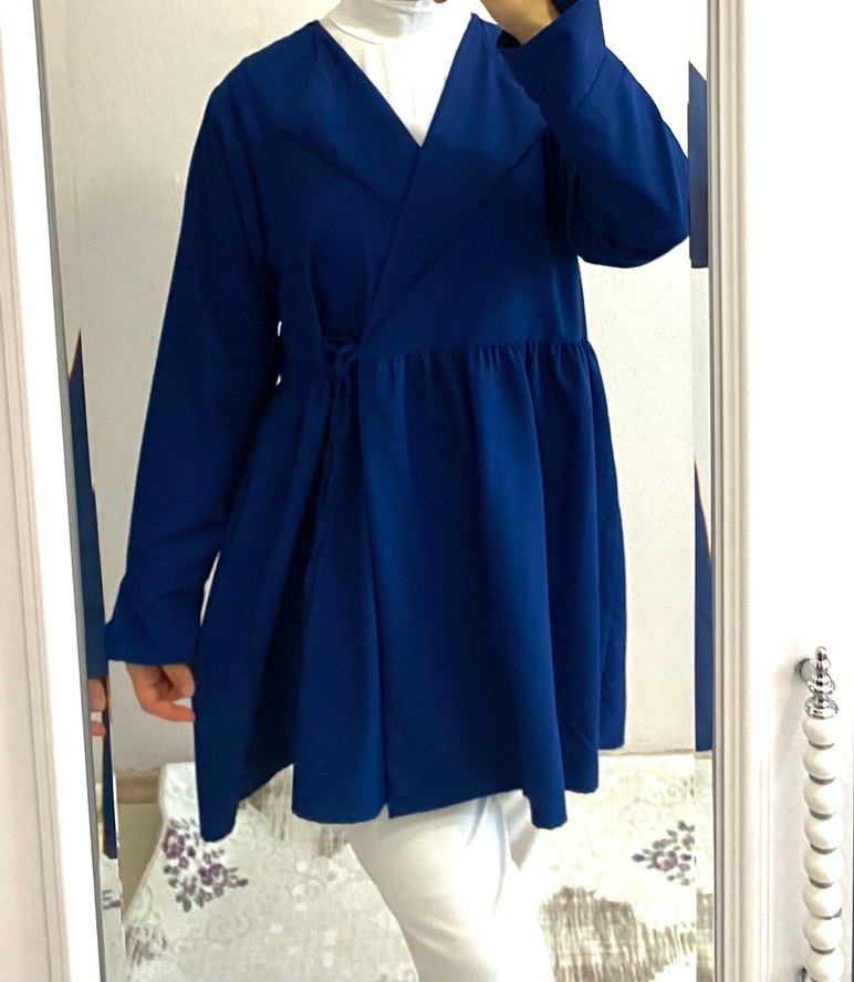 Koyu mavi renkli, yakası kırmalı ve drapeli uzun kollu kadın kimono.Rahat kesimi ve yumuşak sentetik kumaşı ile gündelik şık tarz sunar.