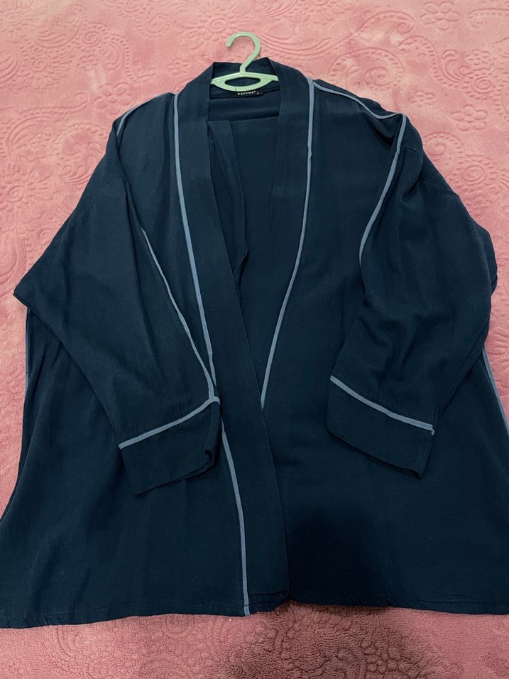 Lacivert renkte, uzun kollu ve regular fit kesime sahip kadın kimono. Minimalist normcore tarzında, kenarlarında ince kontrast detaylar bulunur. Düz ve sade görünümlüdür. Alt eşofmanıyla ve kuşağıyla gönderilecek ancak alt eşofman ağı yırtılıp tekrar dikildi. Üst kimono fiyatına hepsini veriyorum.