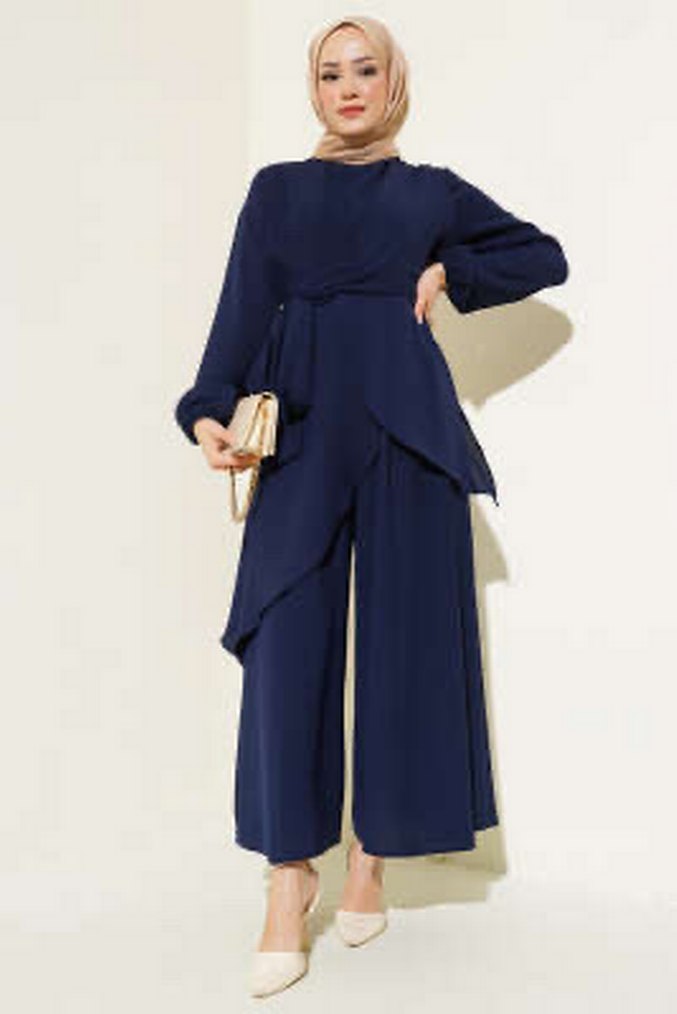 Lacivert renkte, uzun kollu ve yüksek yakalı kadın takımı. İpeksi kumaştan, kemerli ve sade tasarımlı, ofis için uygun uzun ve rahat kesim.