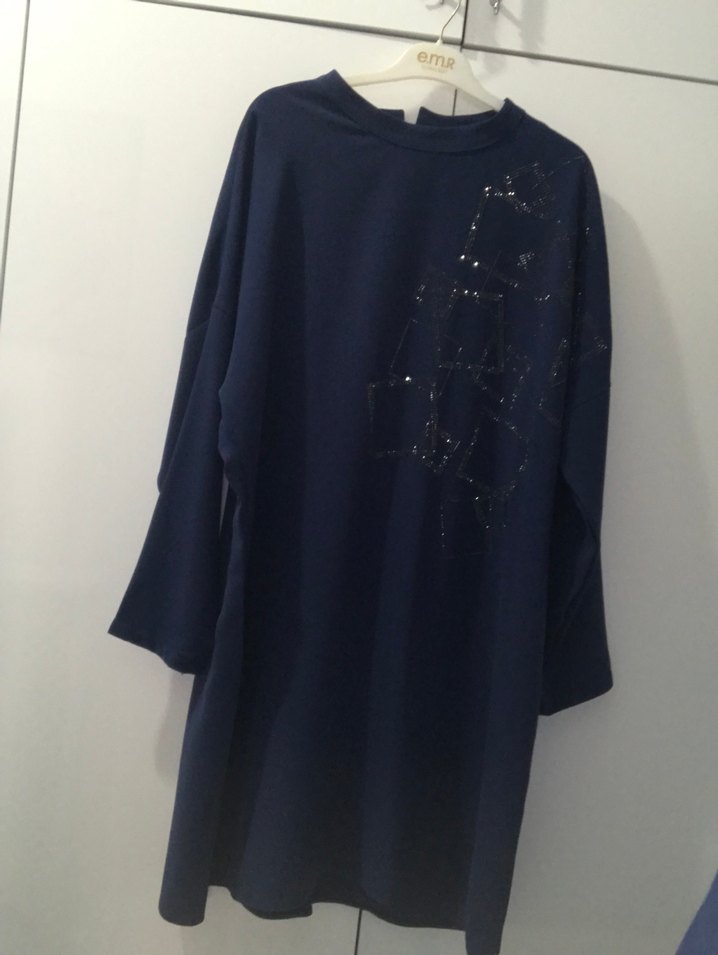 Lacivert, uzun kollu, taşlı ve bol kesim kadın tunik. Yumuşak ve sıcak dokulu kumaştan, drapeli ve yuvarlak yakalı, günlük kullanıma uygun.