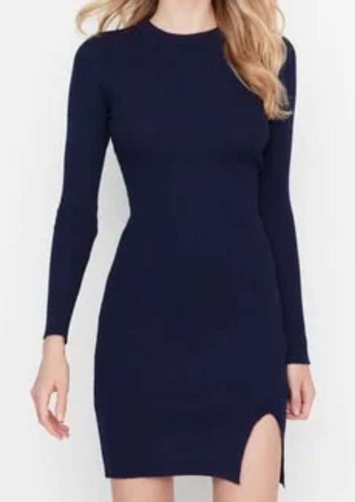 Lacivert kalem elbise, uzun kollu, yuvarlak yakalı ve yırtmaçlıdır. Pürüzsüz sentetik kumaştan yapılmıştır, romantik akşamlar için minimalist tarz sunar. Bir kez giyildi iyi durumda.