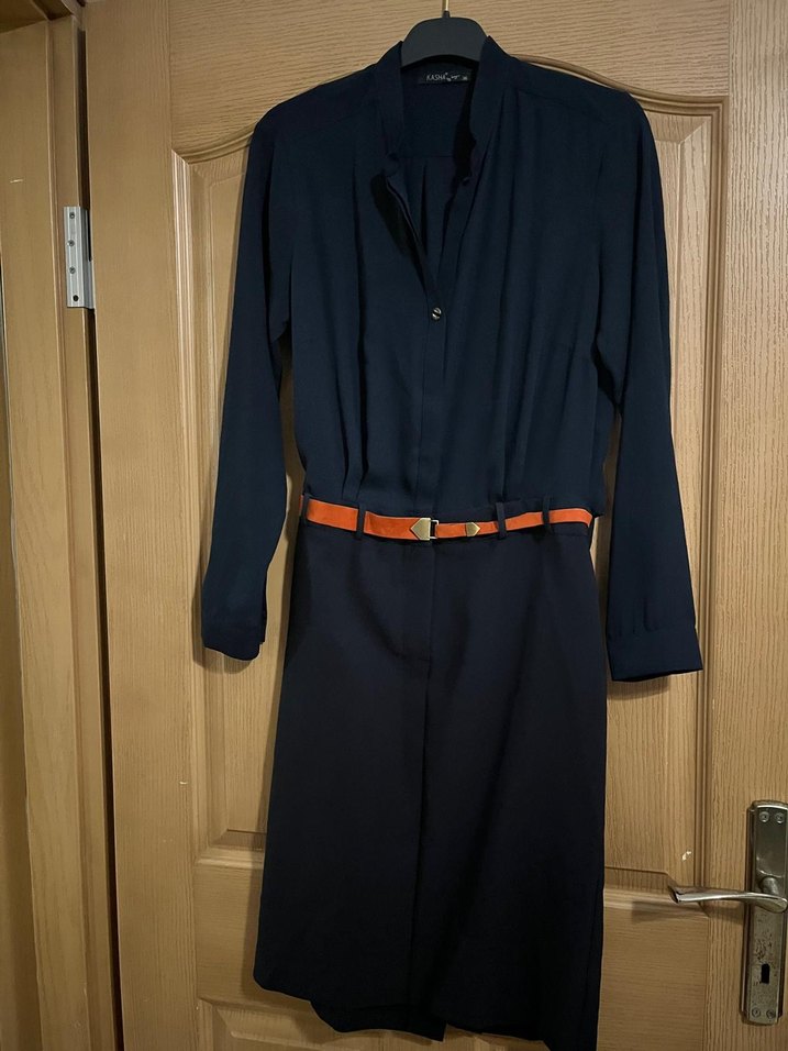 Lacivert renkte, yakalı ve uzun kollu, kemerli ve ipeksi dokulu, normal kesim ofis elbisesi.