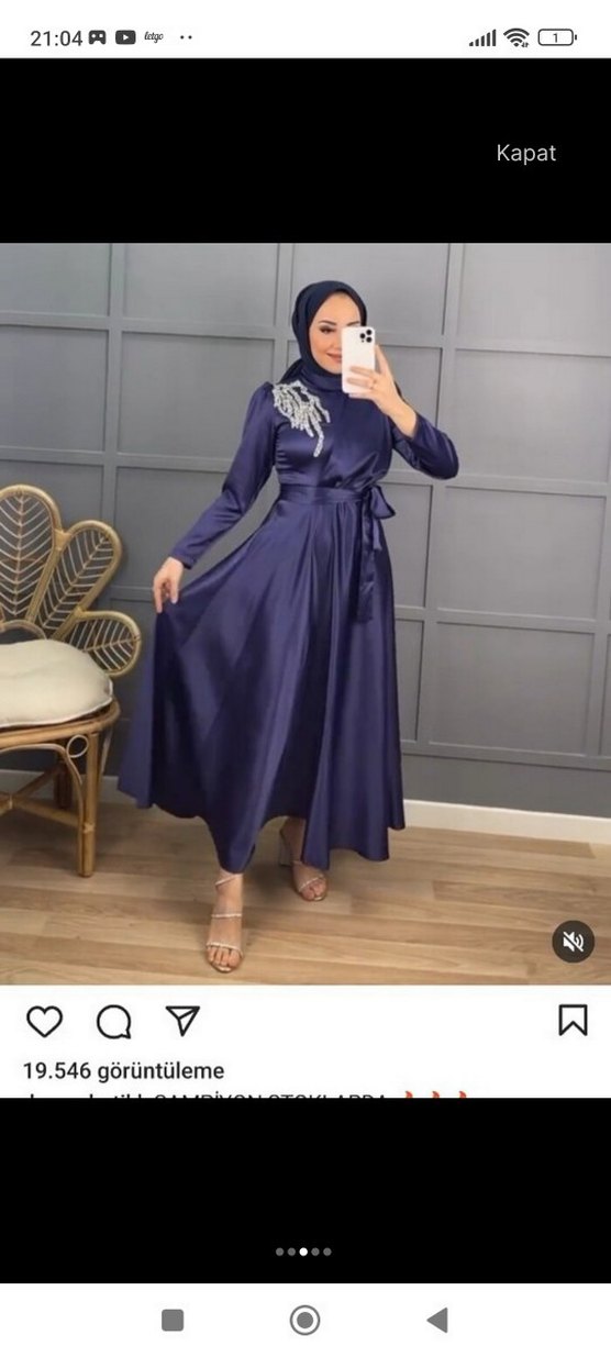 Lacivert, uzun kollu, yüksek yakalı, nakışlı ve kuşaklı, salaş kesim abiye elbise. Düğünler için şık ve gösterişli bir seçenek. ✨