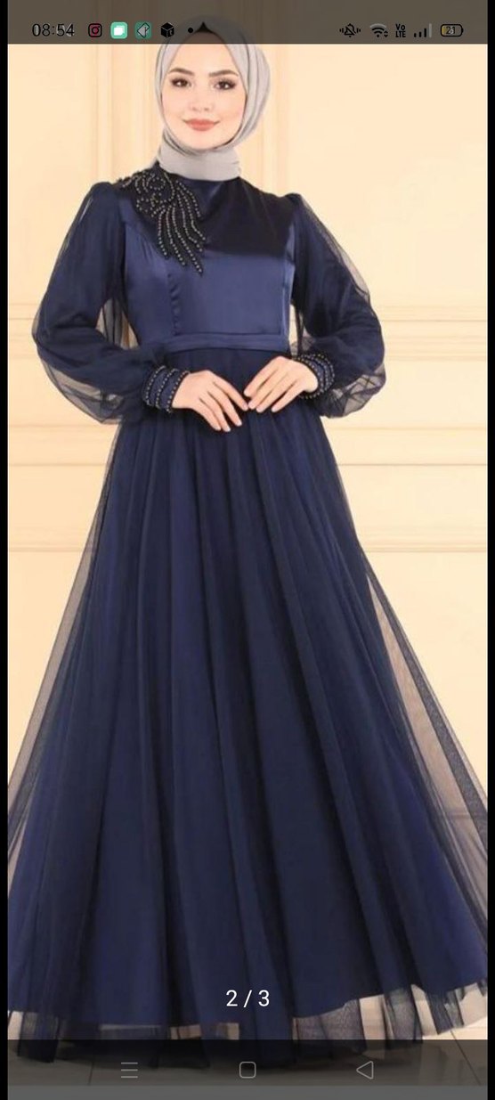 Lacivert renkte, uzun kollu ve yüksek yakalı, nakış detaylı, drapeli ve klasik şıklıkta uzun abiye elbisedir. Düğün ve özel anlar için uygundur.