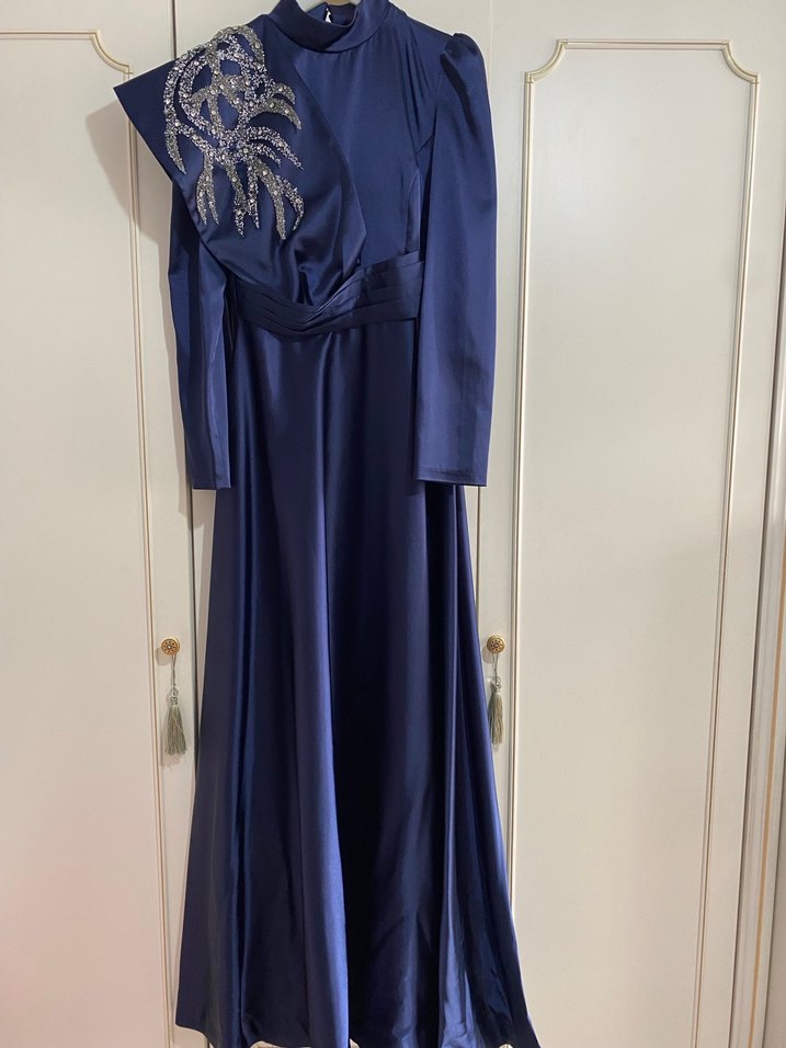 Lacivert uzun kollu, yüksek yakalı, nakış detaylı abiye elbise. Drapeli ve regular fit, düğün ve özel günler için uygun. ✨