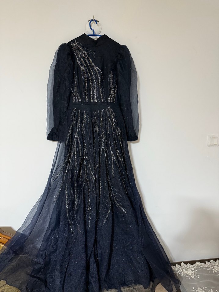Lacivert Uzun Kollu Nakışlı Gotik Abiye Elbise