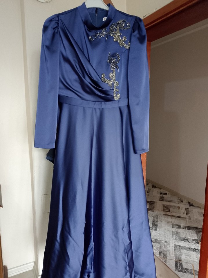 Parlak mavi renkte, uzun kollu ve yüksek yakalı nakışlı uzun abiye elbise. Dökümlü ve klasik kesim, düğünler için uygun vintage tarzda.