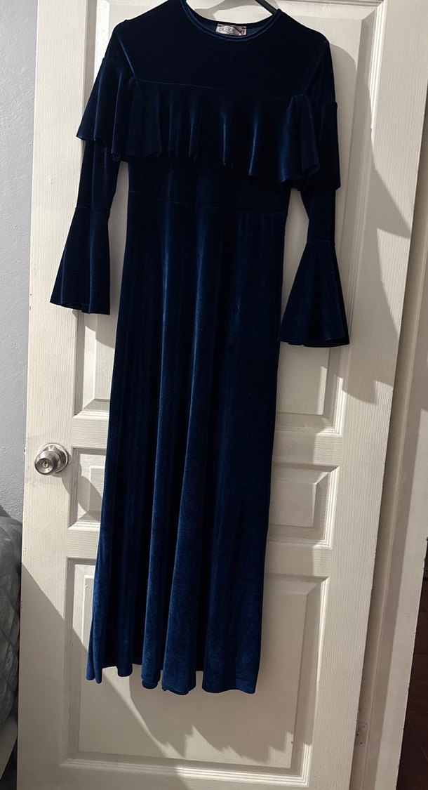 Lacivert uzun elbise, pilili detaylı ve tekne yaka tasarıma sahiptir. Uzun kollu ve hafif genişleyen kollarıyla, yumuşak sentetik kumaştan üretilmiş gotik Paris tarzını yansıtır.