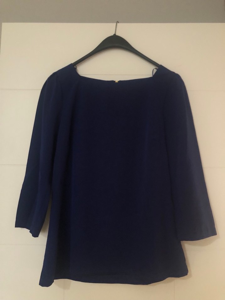 Lacivert, yuvarlak yakalı, uzun kollu, satenimsi kumaştan salaş kesim ve drapeli midi uzunlukta kadın bluz. Minimalist ve ofis kullanımına uygun.
