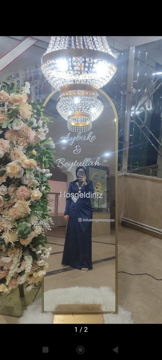 Lacivert, uzun kollu, yüksek yakalı, drapeli, saten kumaştan zarif bir elbisedir. Düğünlere uygun, sade ve rahat kesimlidir. ✨