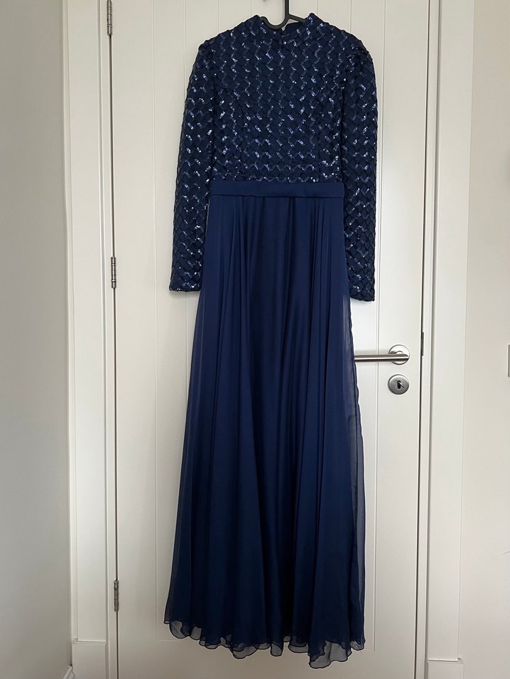 Lacivert uzun kollu, yüksek yakalı, parıltılı abiye elbise. Düğünler için uygun, şık ve zarif bir model. Sadece iki kez giyildi. 38 beden Pınar Şems markalı. Eteğinin uç kısmında küçük bir yırtık mevcut başka bir problemi yok temiz kullanıldı. 172 boy 5-6 cm topukla giyildi, terzide boya göre kesim yapılabilir modeli müsait, yırtılmış olan kısım kesim yapılırsa problem yaratmaz.