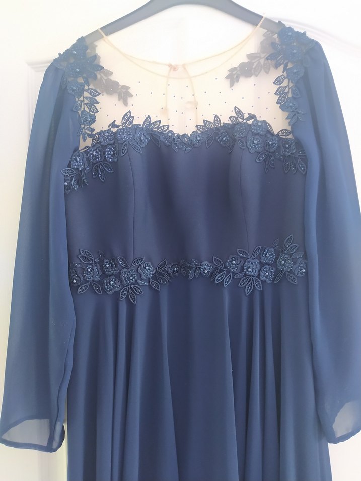 Lacivert uzun kollu, tüllü güpürlü elbise düğünler için uygundur. Modern klasik tarzda, şık ve zarif bir seçimdir. ✨ Boy:1.43