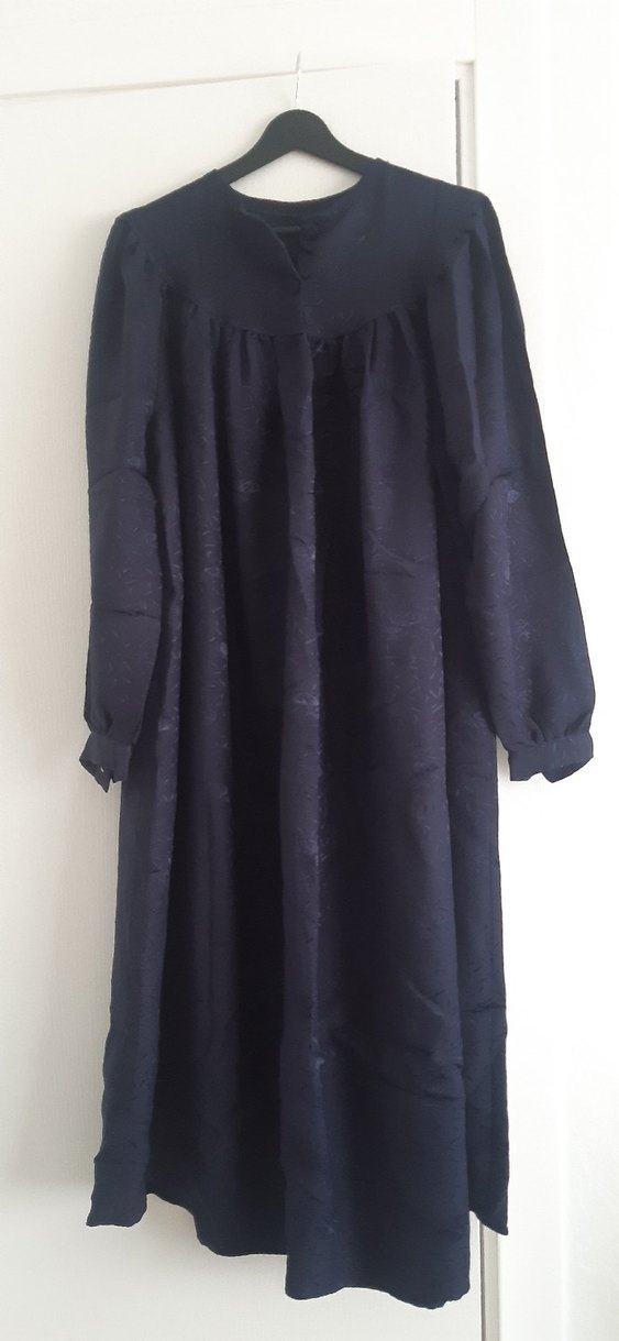 Lacivert, uzun kollu, yüksek yakalı, satenimsi kumaştan, bol kesim ve drapeli uzun kadın elbisesi. günlük kullanımı için uygundur.