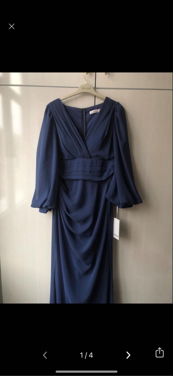 Lacivert uzun kollu, V yaka ve drapeli detaylara sahip uzun elbise. Düzenli kesimi ve modern klasik tarzıyla ofis için uygundur. Klasik şıklık sunar.
