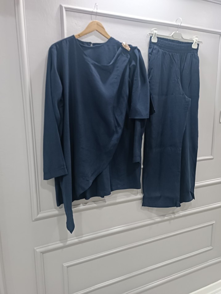 Lacivert, uzun kollu bluz ve pantolon seti. Bluz, yuvarlak yakalı, drapeli ve ipeksi dokuda, pantolon ise rahat kesimlidir.
