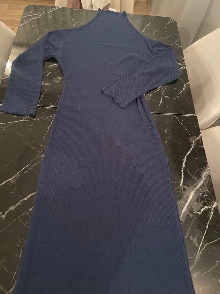 Lacivert, uzun kollu ve yüksek yakalı, vücuda oturan ve drapeli detaylı uzun elbise. Yumuşak sentetik kumaştan, günlük sokak tarzına uygun.