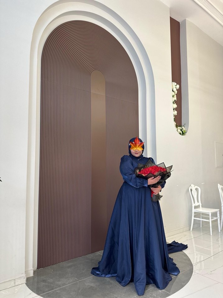 Lacivert uzun elbise, yüksek yakalı ve drapeli detaylara sahip. Uzun kollu, baskılı deseniyle özgün ve şık bir seçim. Özel dikim yaptırdım 48 beden 46 da olur beli kuşaklı. Şal dahil bir kez giydim temizlettim. 9.000 e diktirttim.