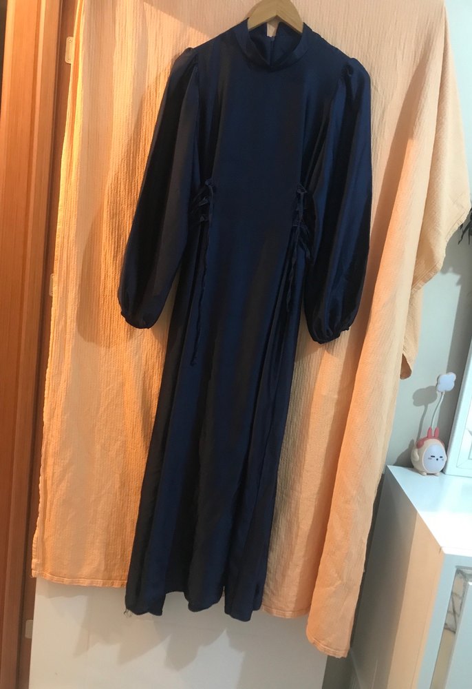 Lacivert renkli, yüksek yakalı ve uzun kollu bu kadın elbisesi, ince ve parlak kumaştan üretilmiştir. Salaş kesimi ve drapeli detaylarıyla ofis için şık bir seçenek sunar.