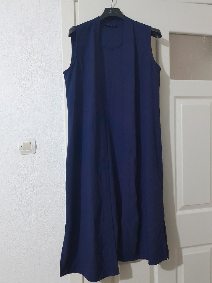 Lacivert renkte, keten kumaştan uzun ve kolsuz, drapeli tasarıma sahip yelek. Yüksek yakalı ve normal kesimdir, minimal ve şık bir görünüm sunar.