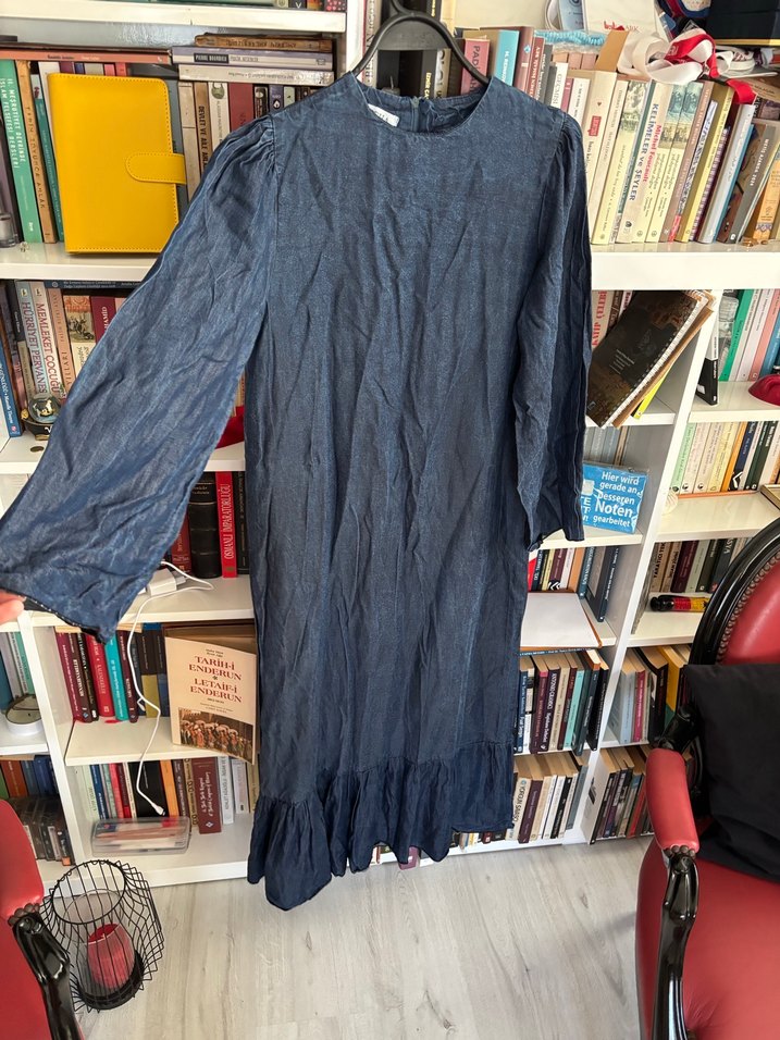 Lacivert uzun kot elbise, bol kesim ve drapeli detaylara sahiptir. Uzun kollu ve yüksek yakalı bohem tarzı, günlük kullanım için uygundur. Boy:132 cm koltukaltı:48 cm omuz:40 cm sorunsuz temiz yıkandı ütülenmedi o yüzden kırışık ince kumaştır bahar ve yazlık bele kemerle çok şık kombinlenebilir sağ arka omzunda çok hafif belli belirsiz bir koyuluk var sebebini bilmiyorum ama ancak 3-4 kez giyildi marka temsili 36-40 beden arası herkese uygundur