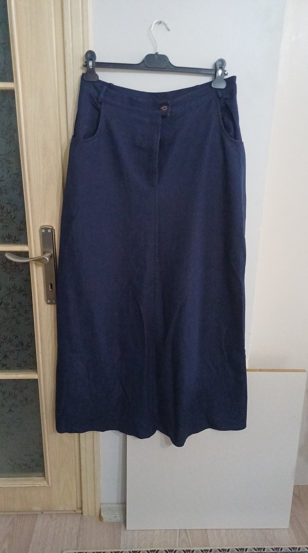 Lacivert uzun boy kot etek, rahat loose fit ve desen içermeyen sade tasarıma sahiptir. Ofis kullanımı için uygundur, zahmetsiz şıklık sunar.