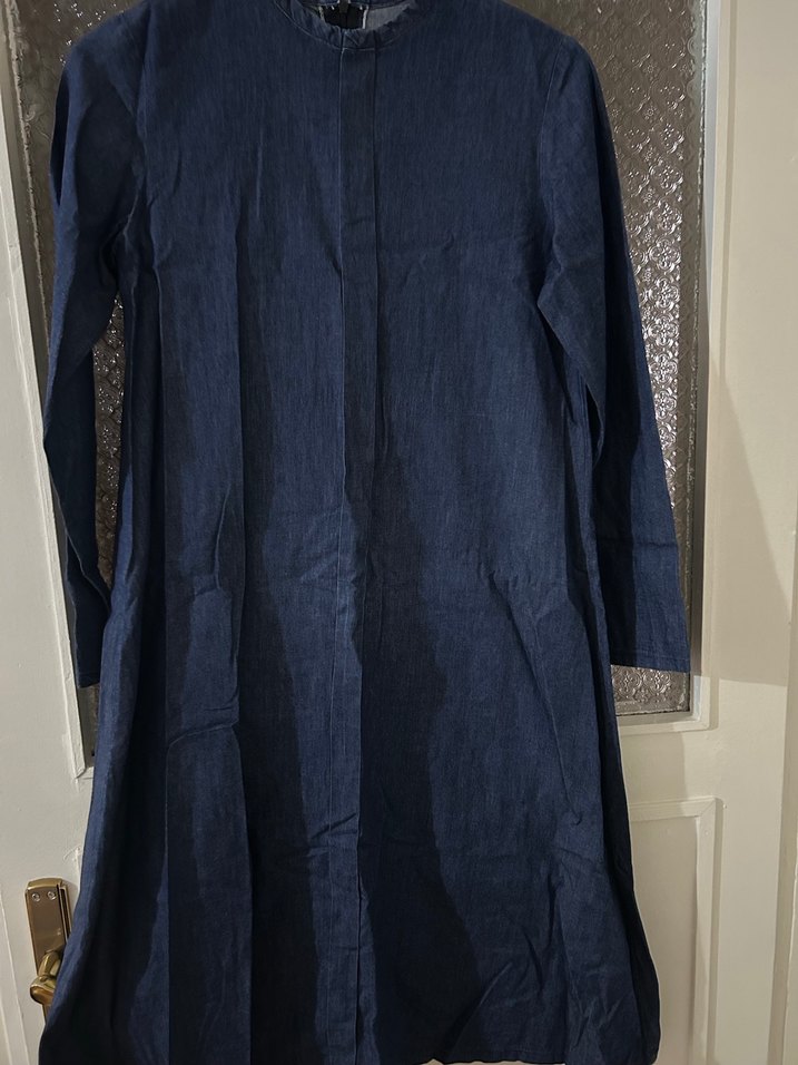 Lacivert renkte, kot kumaştan uzun boy, uzun kollu, yüksek yakalı kadın tunik.Önü pat detaylıdır. Tunik boyu 106 cm, omuz genişliği 11 cm , göğüs genişliği 89 cm , kol boyu 57 cm’dir. Etek genişliği 180 cm’dir. Koltuk altından hafif kloş inmektedir. Kendi dikimimdir.