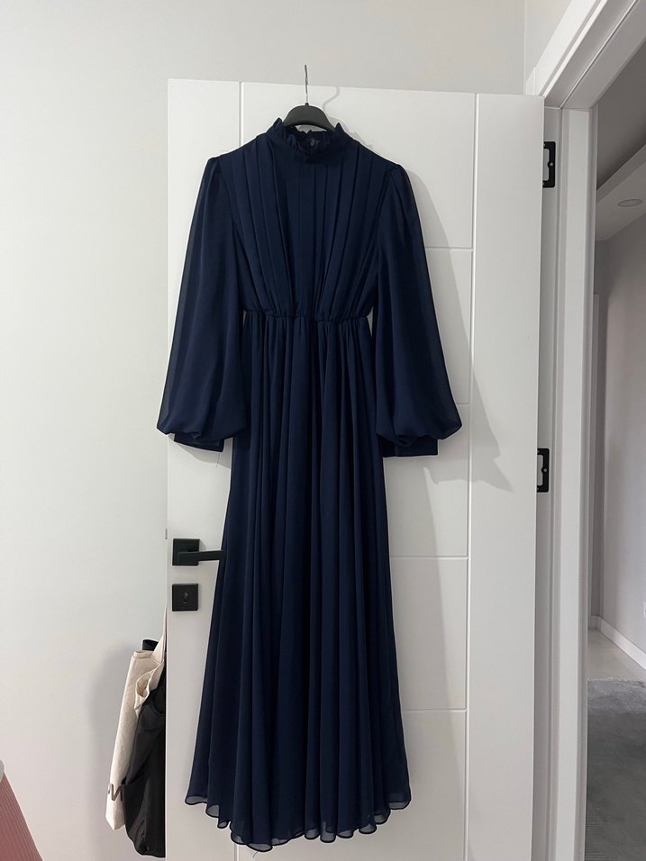 Lacivert uzun elbise, pileli detaylara ve yüksek yakaya sahiptir. Yumuşak sentetik kumaştan, düzenli kesim ve askılı kolludur. Ofis için modern klasik tarzda uygun. Ürün boyu 140 cm Beli lastikli esnektir esnememis hali ile bel cevresi 54 cm İki koltukarasi mesafe 40 cm