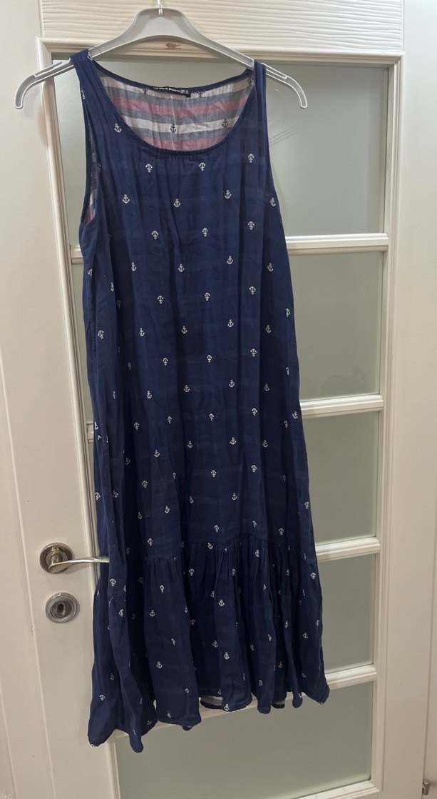 Lacivert keten kumaştan uzun, salaş kesim ve kolsuz elbise. Yüksek yakalı, bohem tarzda, ince fırfır detayları bulunur. Günlük kullanıma uygun.